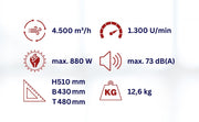 • Enorme Leistung: Drei Gebläsestufen mit bis zu 4500 m³/h Luftvolumen.